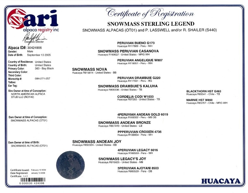 Hengst des Jahres 2005 Dark Huacaya in den USA über alle Shows.Ein absoluter Ausnahmehengst in Fliesqualität und Phänotyp. Seine Nachkommen sind Champions und Blaue Band Gewinner.Snowmass Sterling Legend ist einer der feinsten Söhne von Snowmass Nova.
