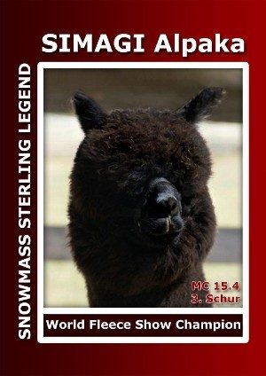 Dieser ultrafeine und extrem dichte Zuchthengst – Snowmass Sterling Legend – gewinnt 2009 die AOBA Fleece Show als Grand Champion in den USA. Er hat bis jetzt fast ausnahmslos schwarze und graue Nachkommen gezeugt (eine fawn farbene Stute). Sein Sohn Sterling Rose ist mit ( AFD 14,1 / SD 3,4 / CV 24,2 / %>30 1,1) nur ein Beispiel der überragenden Qualität von Snowmass Sterling Legend.